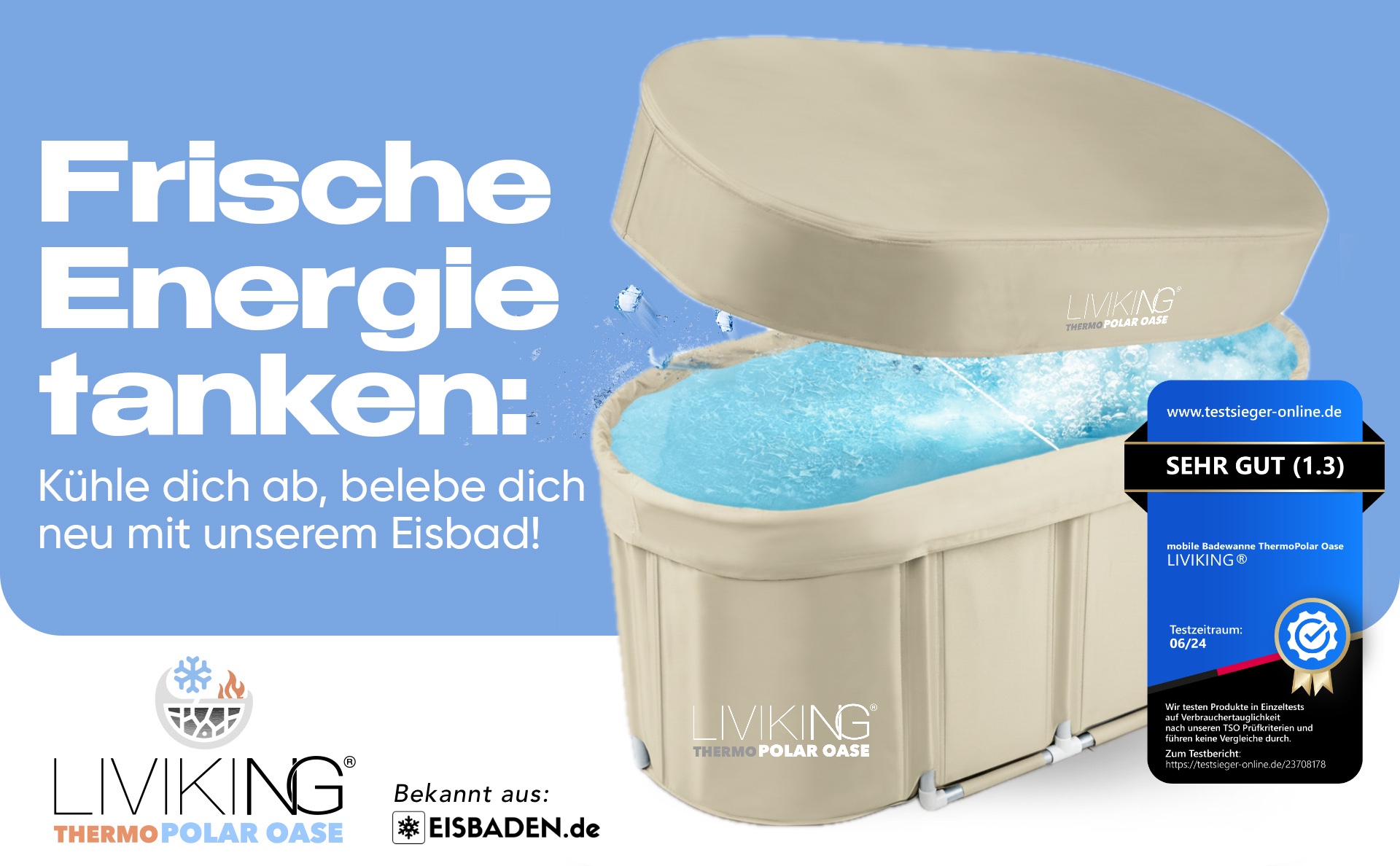 Erlebe die Vorteile von Eisbaden und Entspannung mit der multifunktionalen LIVIKING® Eisbadewanne. Perfekt für Eisbaden, Regeneration und Wellness – mobil, platzsparend und mit innovativer ThermoPolar-Isolierung für langanhaltende Temperaturkontrolle.